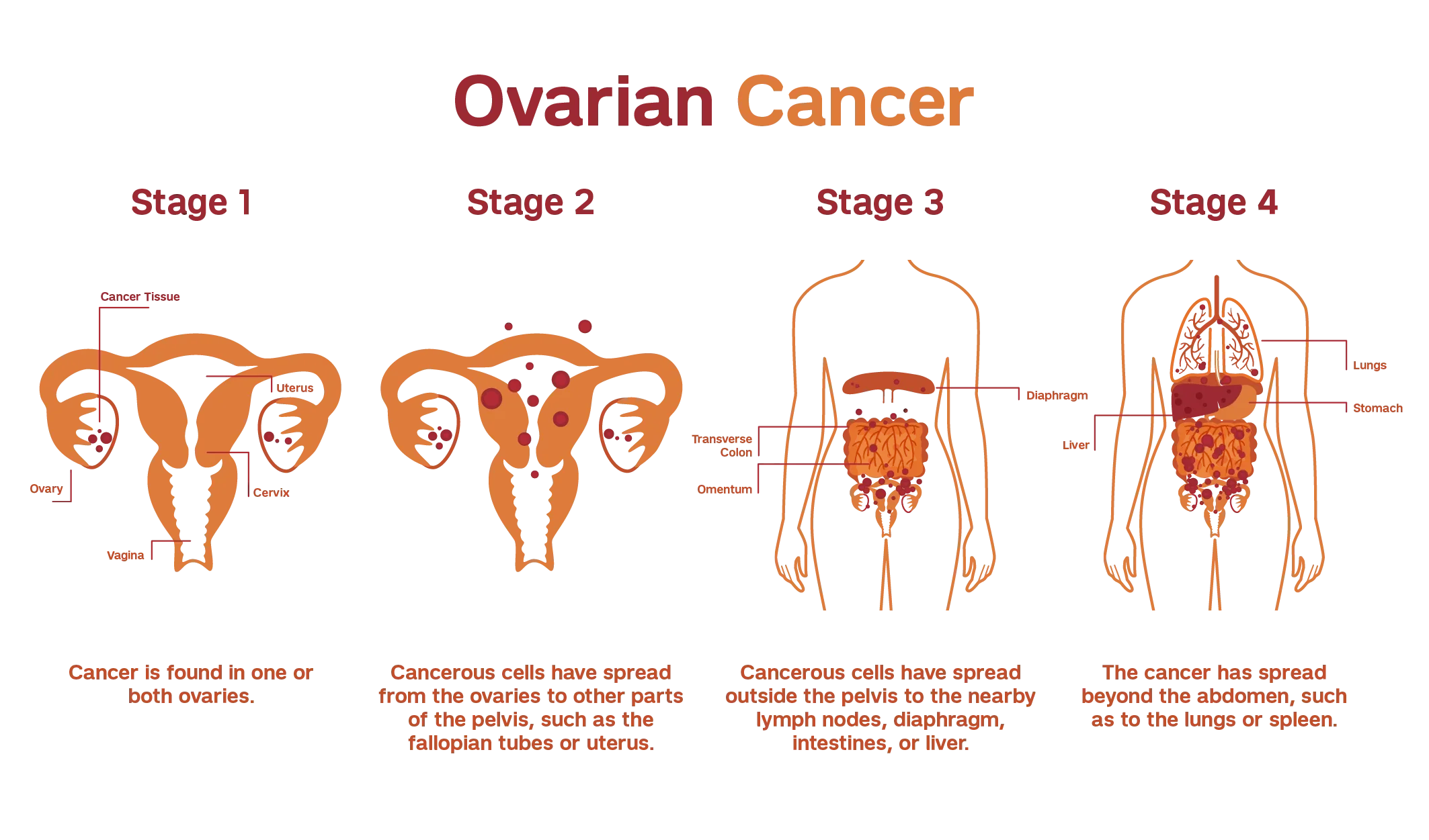 Visual Reference: The staging image illustrates how ovarian cancer progresses through these stages, highlighting why early detection is so critical.
