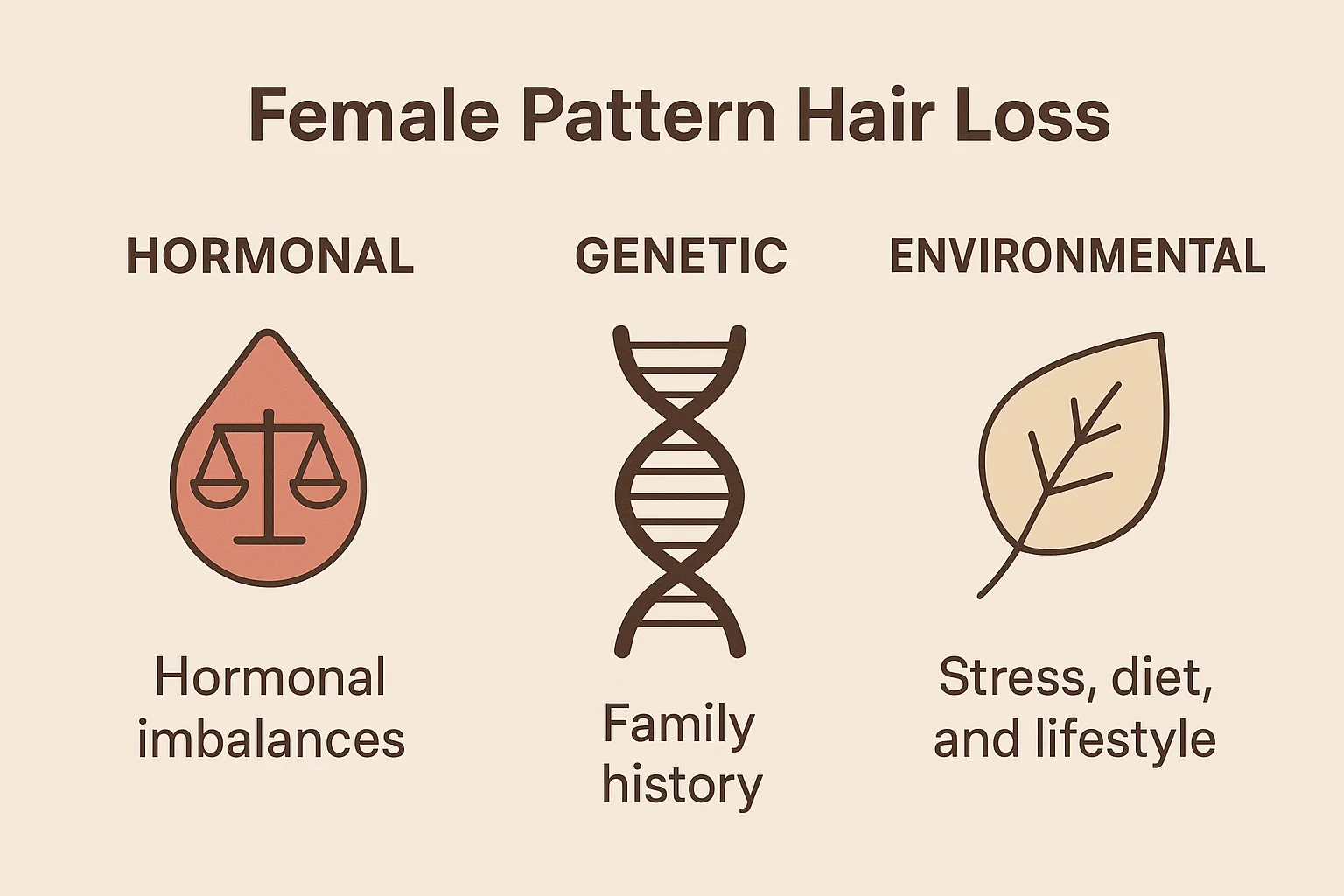 Hair loss in women is rarely caused by a single factor. Instead, it’s usually the result of a combination of biological, hormonal, and lifestyle influences. Below are the most common causes: