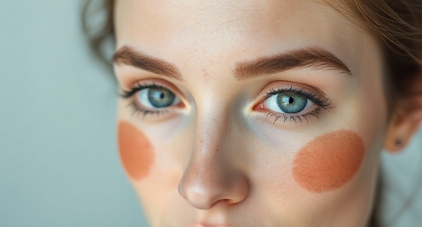 Melasma typically presents as symmetrical patches of discoloration. The affected areas are usually flat and darker than the surrounding skin, with colors ranging from light brown to dark gray-brown.